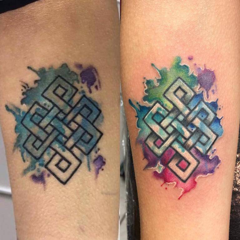Эскиз является узлом любви, обозначает теплые чувства, дружбу и верность. Он представляет из себя замысловатые узоры, в центре которых находится сердце с короной. Если хотите духовно сблизиться с партнером – выбор этой тату для Вас.
