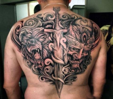 В татуировках для мужчин важно подчеркнуть их силу, для этого подходят изображения зверей (волка, быка, вепря) мифические изображения драконов