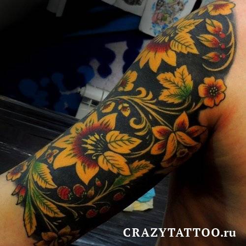 К славянским мотивам относят и стилизацию под русский стиль. С лёгкой руки любителей тату в моду вошли хохломские узоры: цветы на тату и эскизах пестрят яркими красками, выделяясь на фоне чёрно-белых трайбла, дотворка и блэкворка.