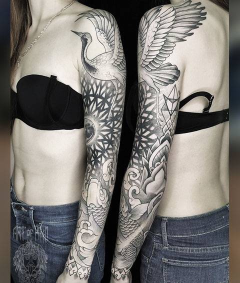 Птицы и животныеЭта категория условно делится на существа реальных и воображаемых. К последним относятся дракон, олицетворяющий силу и мощь, жар-птица (мудрость и возрождение) и др. также часто встречается изображение тигра — символа волевого нрава, пчелы, отождествляемой с трудолюбием, бережливостью и трудолюбием. Считается, что татуировка с зайцем помогает познать радость материнства и даже облегчает роды, поскольку животное ассоциируется с женским началом.
