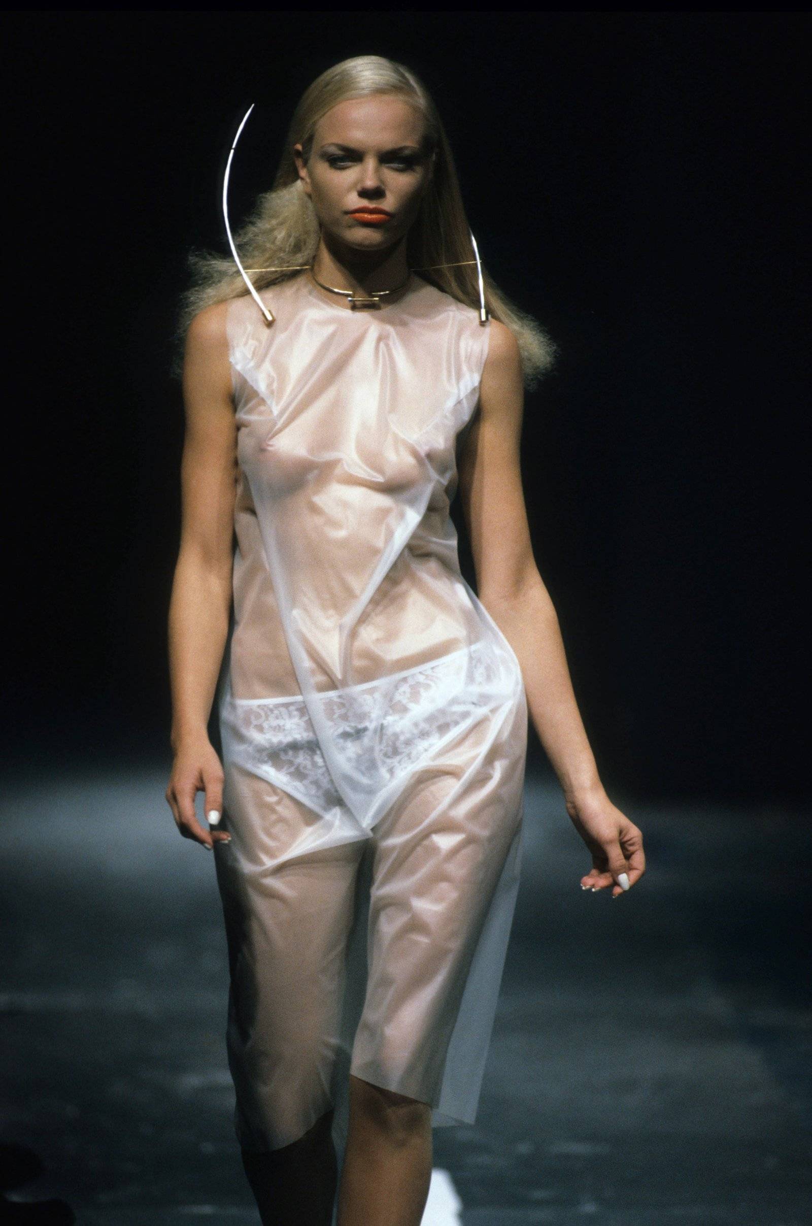 Александр Маккуин знал, что его следующая коллекция будет посвящена фильму «Птицы» Хичкока, но работу над ней начал спонтанно. Однажды, прогуливаясь с другом, он заметил на улице рулон пластиковой пленки и тут же загорелся идеей сделать из него платье. Добавил шелка и латекса, перевязал все нитью и объявил, что первый наряд готов.