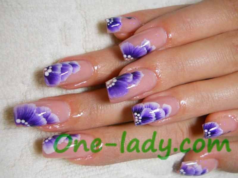 Чтобы выполнить этот рисунок, нужно нанести на ногти прозрачный лак. Затем окунуть одну часть плоской кисти в фиолетовую краску, а оставшуюся — в розовую. Желательно, чтобы обе эти краски находились на палитре рядом. Волнообразными движениями нарисовать лепестки и поставить тонкой кисточкой белые точки в самой середине пиона. Для получения более четкого контура пионы следует обвести черной или белой линией. Как только рисунок высохнет, нанести закрепитель.