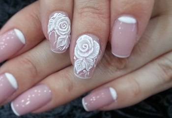 Дизайн с применением акриловой лепки очень популярен в качестве свадебного маникюра. Очень красиво смотрится акриловая роза на маникюре во французском стиле. Чтобы выполнить этот дизайн ногтей, нужно заранее подготовить ногтевую пластину, сделав маникюр по всем правилам и нарастив ногти в технике френч. Затем, подготовив акриловую пудру, мономер и плотную глянцевую бумагу, можно приступать к лепке: