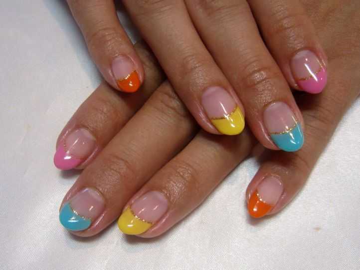 - Разноцветный французский маникюр. Выполняется он чаще всего гель-лаком, с помощью которого довольно легко создавать цветовые переходы. Яркие ноготки подчеркнут индивидуальность девушки.