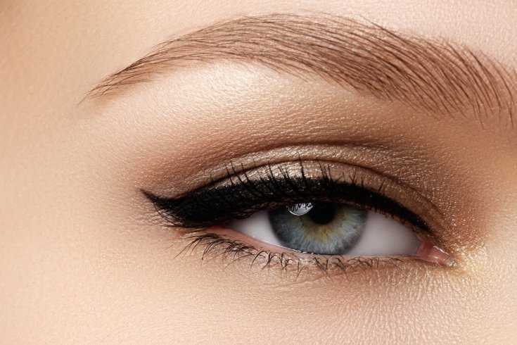 - Можно использовать подводку, но без стрелок. Линия обязательно должна ложиться тонкой полоской от середины глаза и утолщаться к внешней части.