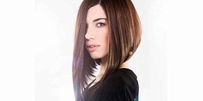 - С удлинением . Идеальный вариант для деловой леди, ценящей удобство и стиль. Особенность в том, что на затылке короткие пряди, которые постепенно удлиняются, причем длина может быть асимметрична.