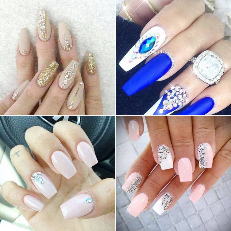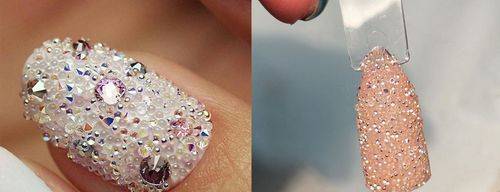 Какие бы стразы вы ни решили использовать, учитывайте, что на короткие ногти лучше клеить мелкие камешки, а крупные стразы лучше взять для инкрустации длинных ногтей, причем единично (на фото представлены варианты дизайна длинных и коротких ногтей). В противном случае маникюр будет выглядеть тяжеловесно и безвкусно. Если же вы хотите целиком покрыть ноготок стразами, используйте самые мелкие кристаллы одинакового размера.