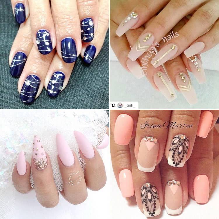 Какие бы стразы вы ни решили использовать, учитывайте, что на короткие ногти лучше клеить мелкие камешки, а крупные стразы лучше взять для инкрустации длинных ногтей, причем единично (на фото представлены варианты дизайна длинных и коротких ногтей). В противном случае маникюр будет выглядеть тяжеловесно и безвкусно. Если же вы хотите целиком покрыть ноготок стразами, используйте самые мелкие кристаллы одинакового размера.