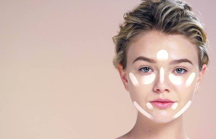Используя крем-маркер, начните с выделения челюсти, переносицы, области под глазами, верхней части щек, углов рта и центра лба.