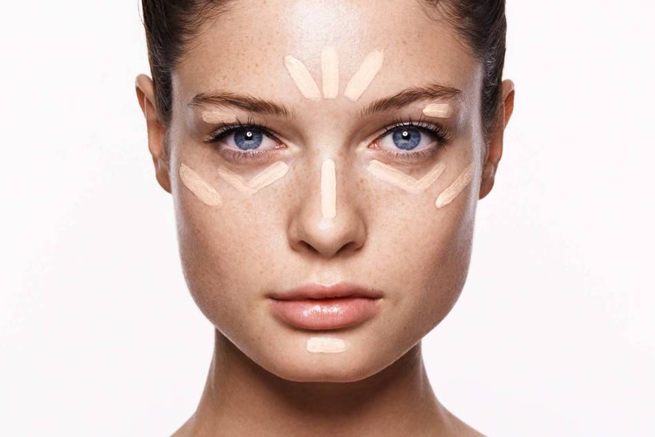 : мазки под нижней губой, по верхним линиям скул, в виде перевёрнутого треугольника под глазами, под бровями, по линии носа. Лоб тоже стоит обработать, но нанести при этом не один мазок, а три, которые будут сходиться к переносице