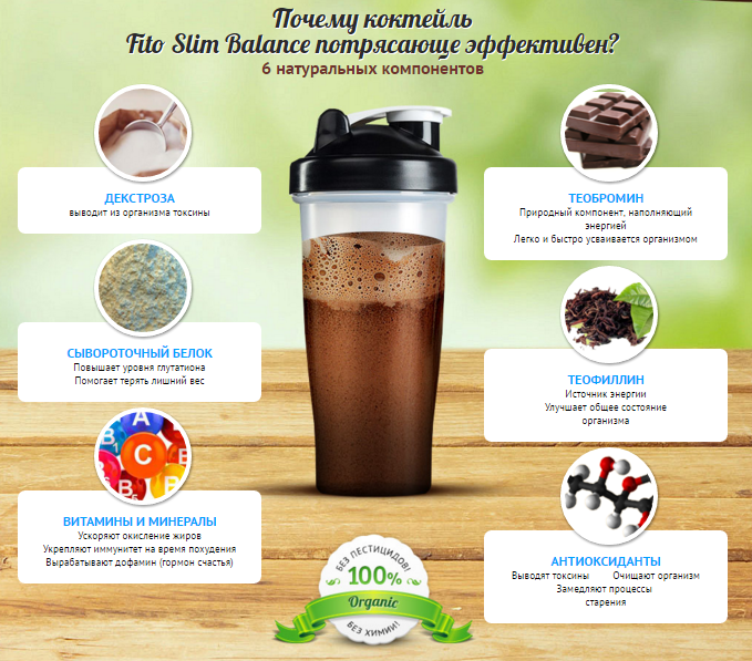 Уникальный коктейль для похудения Fito Slim Balance решает эти задачи вкусно, нейтрализуя голод, снижая вес до естественной нормы и питая тело энергией. Рецепт идеального ужина найден — сбалансированный коктейль со всеми жизненно необходимыми компонентами и микроэлементами. Лишний вес — это не только избыточное количество килограммов, но и плохое самочувствие, низкий жизненный тонус, комплексы и даже депрессия. Похудение — это изнурительный ежедневный труд, который не всегда приносит ожидаемые плоды. Это действительно трудно — лишать себя ужина, задержавшись на работе позднее обычного. На стрелки, которые умчались далеко за шесть, смотреть с ненавистью. Проходить мимо студий аэробики и шейпинга и усердно записывать контакты. Смотреть завистливо на счастливчиков, поглощающих сладкие десерты, и уныло думать об обезжиренном хроническом стаканчике йогурта без сахара. Худеть с удовольствием, худеть вкусно и безопасно, укрепляя свое здоровье и повышая иммунитет, — это все о нем.