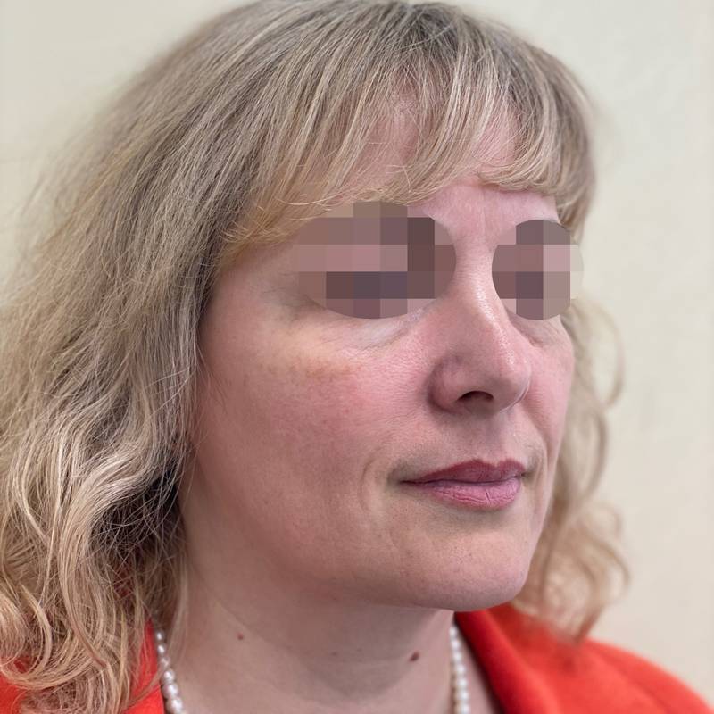 При осмотре: дефицит мягких тканей в области средней трети лица. Кожа бледная, с большим количеством расширенных пор и мелких морщин. Имеется выраженная носогубная складка градиентного типа (с нависанием валика ткани над бороздой). При пальпации отмечено снижение тонуса кожи, при ротационно-компрессионном тесте – образование множества мелких морщин. Тест на эластичность нижнего века (щипковый тест) – расправление складки с задержкой в 2–3 секунды.