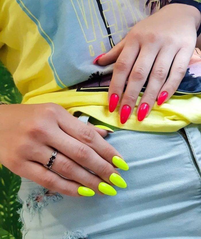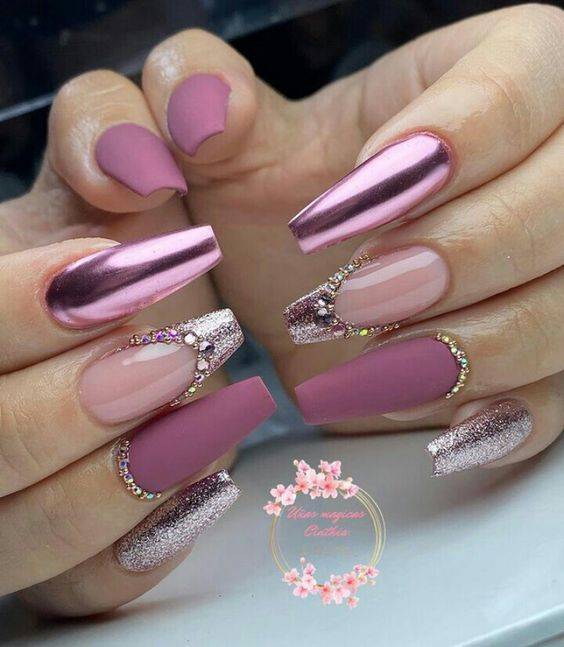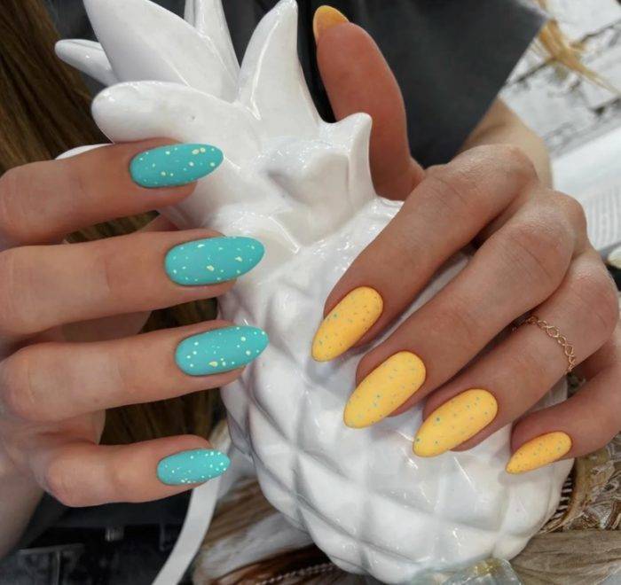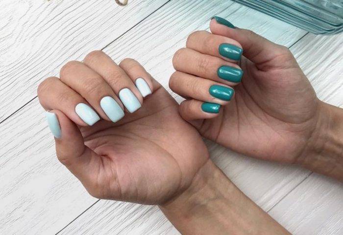 Стильный дизайн «разные руки» обретает популярность с небольшими изменениями. В моду входит сочетание с матовым топом. Ногти на руках покрываются разными оттенками, сверху наносится матовый топ. Такой маникюр смотрится эффектно, стильно.