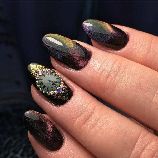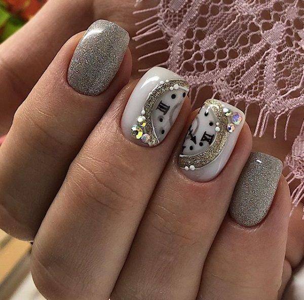 Этот дизайн, конечно, не новинка, но для встречи Нового года он остается актуальным. Изобразить часы на ноготках – дело непростое, поэтому заранее найдите мастера, который сможет воплотить задумку в жизнь. Вокруг циферблата можно прорисовать изящные узоры или же выложить все стразами. Либо воспользуйтесь популярной сегодня в нейл-сегменте тонкой проволокой, она органично впишется в этот дизайн. Как правило, часы изображают на длинных или средних ногтях, но при желании их можно «разместить» и на короткие ногти. А как это будет выглядеть, мы покажем на фото ниже.