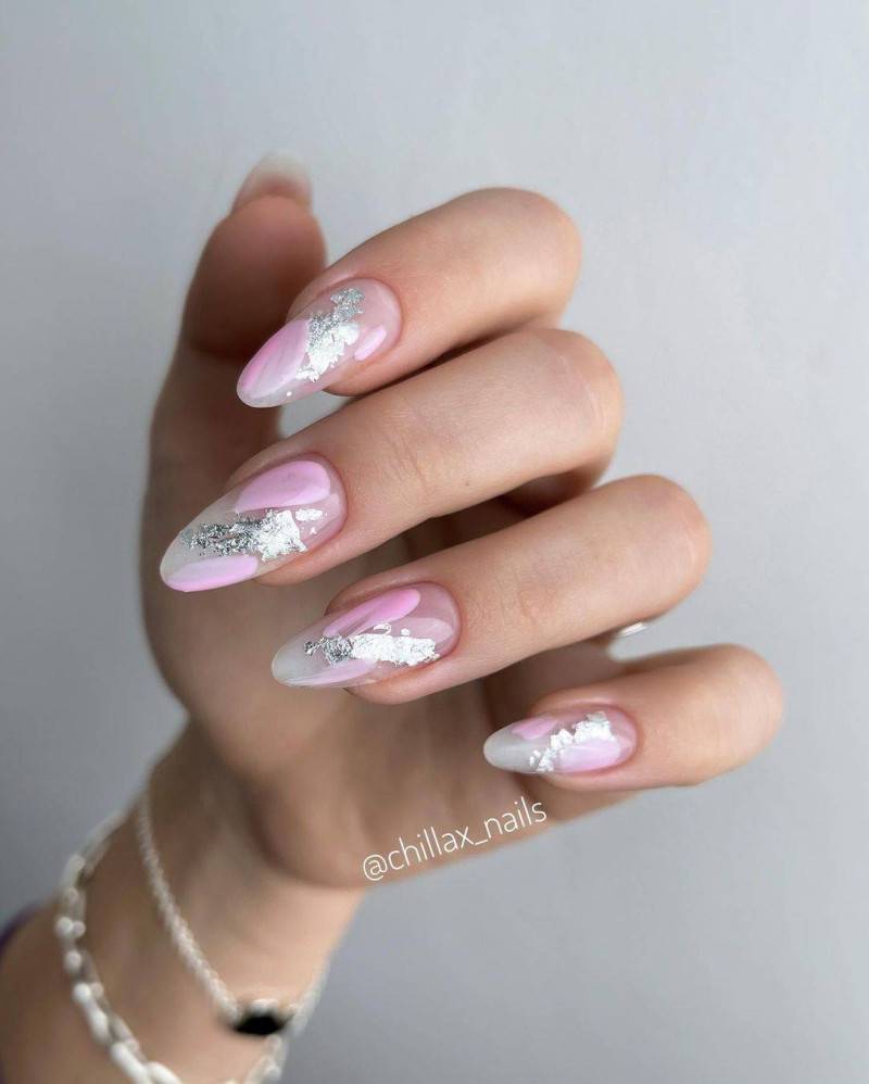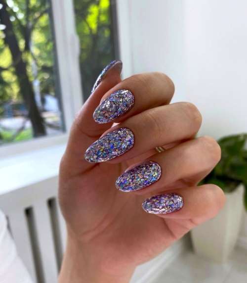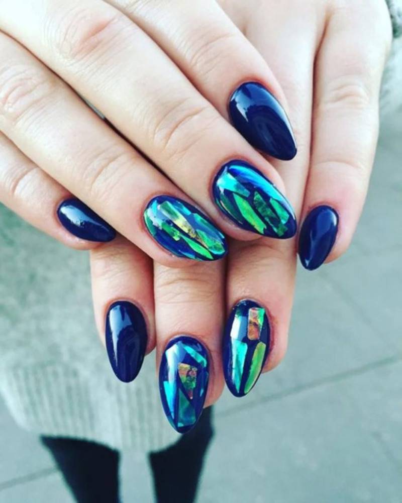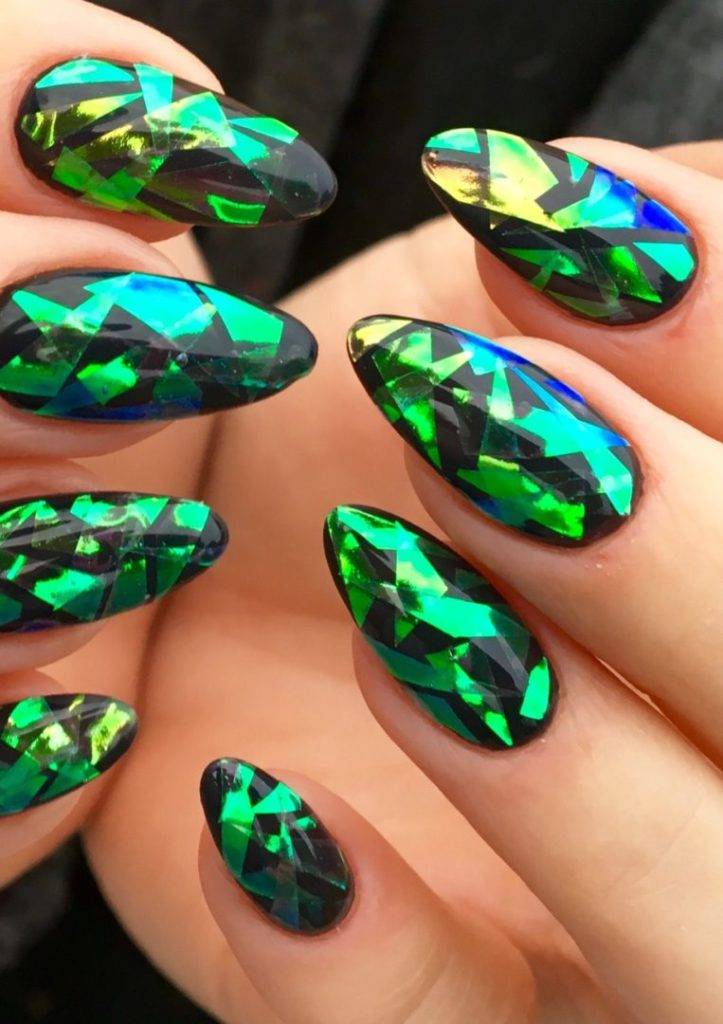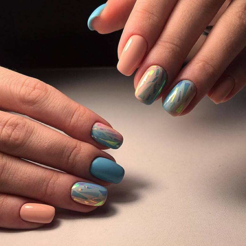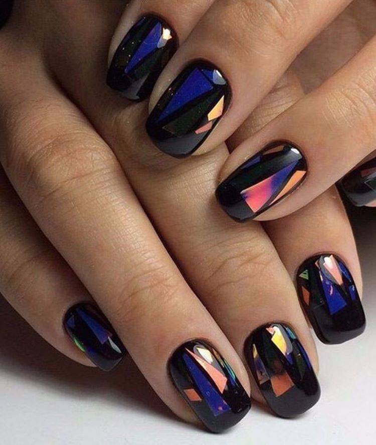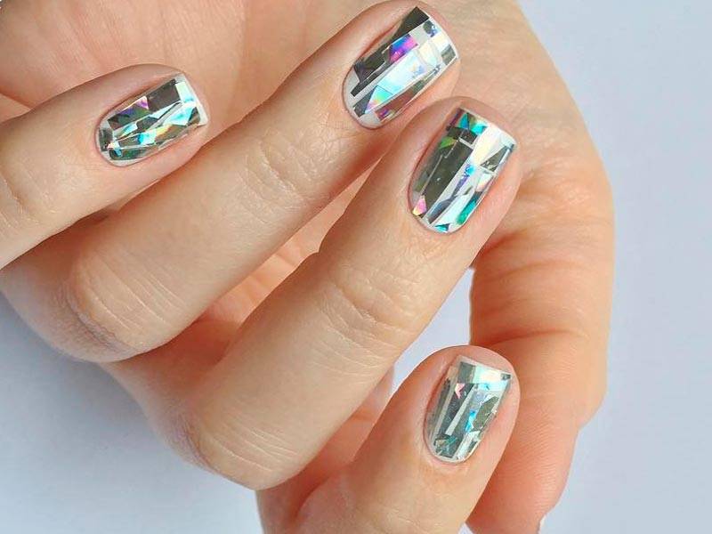 Хотите сделать маникюр, словно из сказки о Снежной королеве? Выбирайте дизайн «битое стекло». Это необычный вариант, когда с помощью кусочков фольги мастер создает на пластине эффект осколков стекла или льда. Смотрится очень многогранно и загадочно.