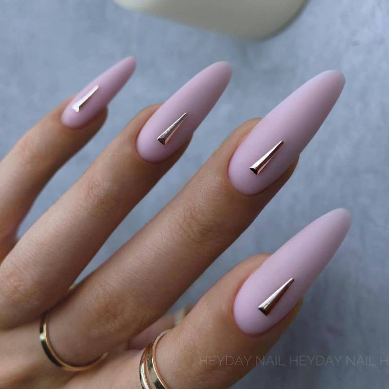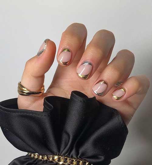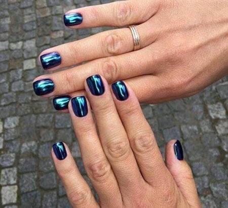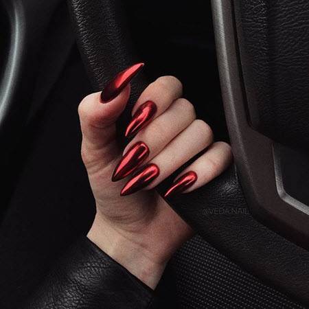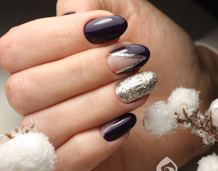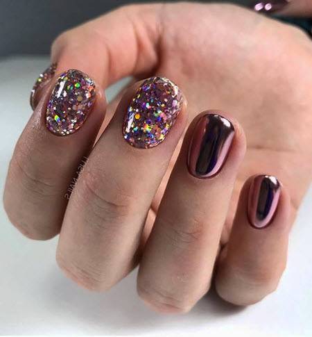 Если у вас очень маленькие ногти, а хочется, чтобы они выглядели длиннее, вот праздничный дизайн, который вам подойдет. Цвета металлик во всю длину ногтя визуально вытягивают и корректирует форму. Модно делать акцент на центральной части или сбоку, конечно, если нравится. Помимо этого рекомендуем золотые и серебряные узоры на «голых» ногтях.