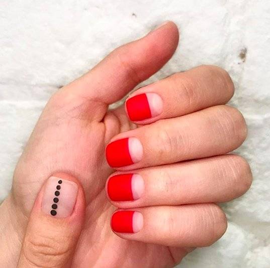 Не менее интересен в этом дизайне и френч. Подойдут яркие оттенки ободка или привычная белая гамма. Интересно будет выглядеть на одной руке френч ярко-розового цвета, на другой – ярко-оранжевого. Возможен вариант, когда на одной руке френч черный, на другой – белый. Для эффекта можно добавить матовый топ.