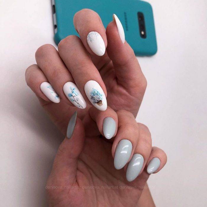 Еще один интересный вариант – на одной руке ногти окрашены однотонным цветом, на второй руке на прозрачной или белой основе нанесены рисунки с помощью наклеек в тон цвету первой руки. Хорошо смотрятся веточки, цветы, абстрактные картинки.