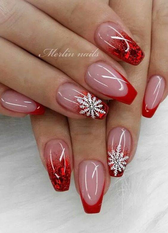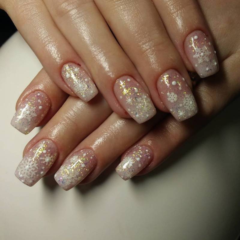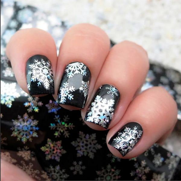 Нежный и довольно простой в исполнении дизайн, ведь каждый из нас с детства умеет рисовать этот главный символ зимы. Изображайте снежинки на белом, голубом, синем или прозрачном базовом покрытии, чтобы нейл-арт соответствовал времени года. Прорисовывайте их белым лаком, серебряными блестками или используйте специальные голографические наклейки. Выложить крупные снежинки на длинных ногтях можно и из фольги, а также вышеупомянутой акриловой пудры. Одним словом, проявляйте фантазию – она здесь ничем не ограничена.