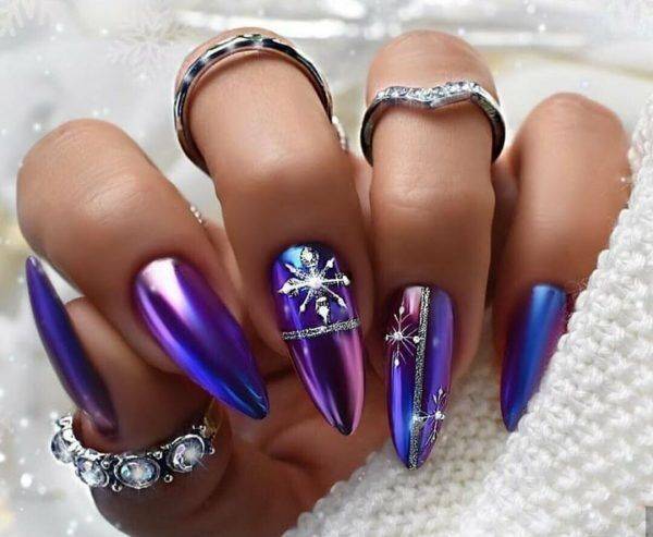 Существует множество вариантов декорирования длинных ногтей зимой. Их форма и размер представляют собой широкое поле для творчества нейл мастеров. Рассмотрим три самых популярных вида морозного маникюра: