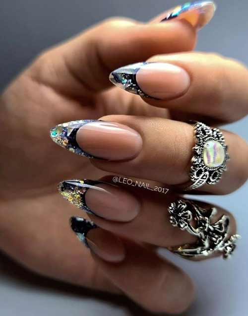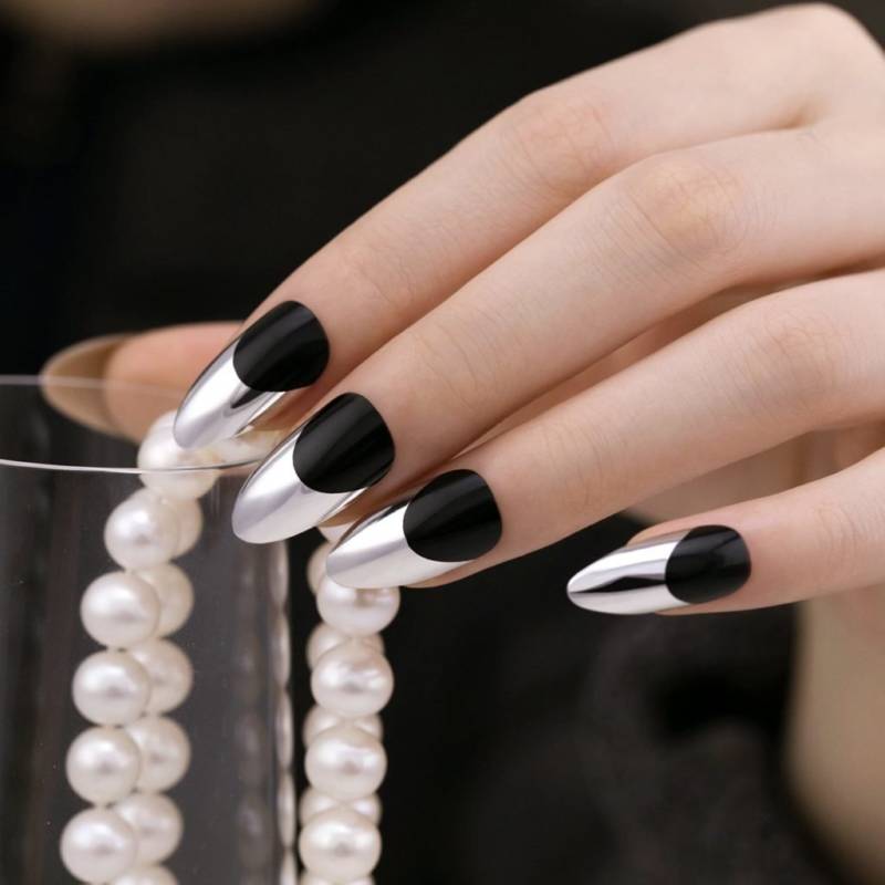Эффектно выглядит голливудский френч, при котором пластину окрашивают темным лаком, а полумесяц у ее основания – светлым или серебристым.