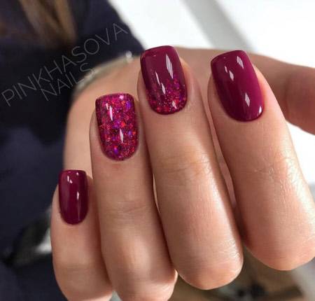 Такие расцветки хорошо выглядят на ногтях круглой и овальной формы. В этом году они оказались в тренде. Маникюр в одном цвете подходит для любого случая. Он прост, элегантен. Если такой вариант кажется слишком скучным, то можно воспользоваться дополнительным декорированием стразами или блестками. Также популярен способ, при котором часть ногтевых пластин матовая, а другая – глянцевая