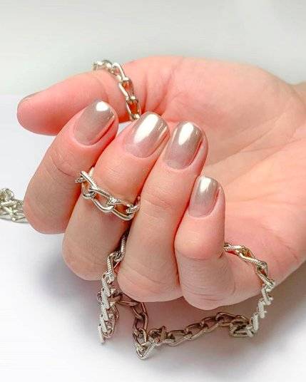 Для новогодней ночи лучше всего подойдет зеркальная втирка – она привлечет внимание к вашим ноготкам и отлично дополнит вечерний наряд с пайетками. На светлых и пастельных оттенках лака очень нежно будет смотреться перламутровый эффект