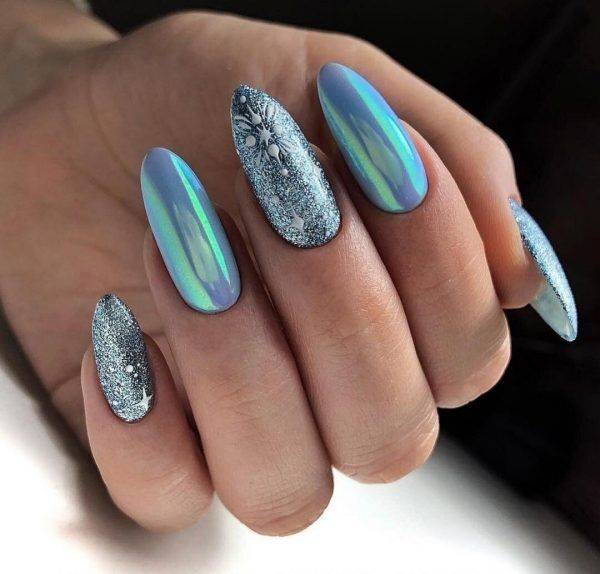 Блестки, так или иначе, всегда присутствуют в маникюре. Но для зимнего дизайна предлагаем сделать блестящий акцент — полностью покрыть пластину глиттером на одном ноготке. Это может быть мизинец или другой пальчик. Отлично смотрится сочетание глиттера и матовой текстуры водном дизайне.