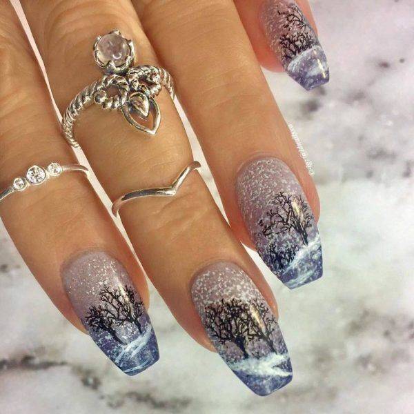 Этот стиль, означающий ни что иное, как «растягивание» лака нескольких оттенков по всей длине ногтевой пластины, очень подходит для обладательниц длинных ногтей. А зимним его сделает применение сине – белой палитры для более светлого, дневного варианта и фиолетово-голубой для темного, вечернего выхода. Плавный переход одного оттенка в другой смело можно украсить стразами, блестками, а также анималистическими рисунками в виде милых котиков, птичек или снеговиков.