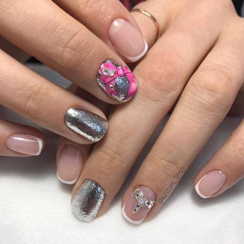Популярен тип «миллениум» — с покрытием края ногтевой пластины фольгой или блестками (см. фото). Оригинальные варианты френча дополняют рисунки, бисер, лепнина. Это делает их произведением искусства.