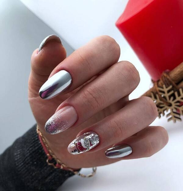 Как вариант новогоднего наряда для ногтей — смотрите на модные блестящие nail-дизайны. Например, трендовая изюминка – френч серебряной или золотой втиркой. Модницам нравится этот дизайн за его изогнутость, обтекаемость, новизну. А также рассмотрите идею с легким, но ярким акцентом — серебряный цвет/рисунок на двух ноготках в черном маникюре.