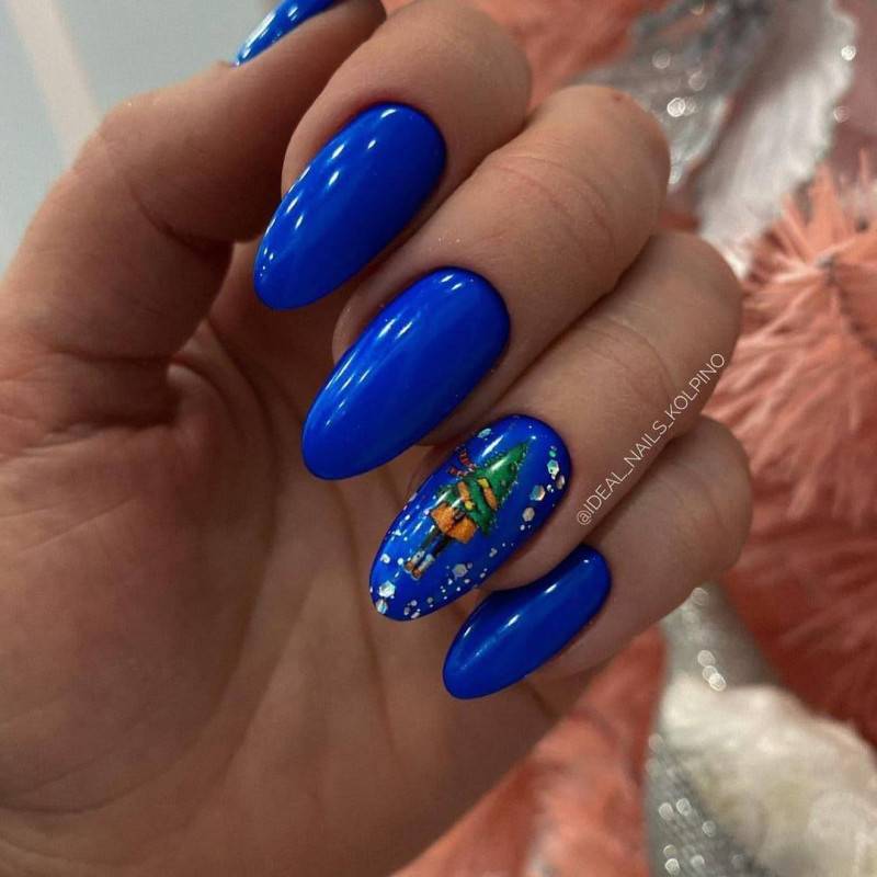Трудно представить зимний маникюр без синего. Им обычно изображаются тени на снегу, ночное небо, зимние цветы изо льда. Насыщенность синего подчеркивают белый, серебряный и золотой декор.
