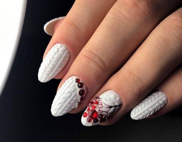 Согревающий эффект создаёт орнамент, который имитирует фактуру крупной вязки в маникюре. Он набирает популярность в нейл-арте, универсален, подходит для любой длины ногтей, прост в исполнении и смотрится в любом сочетании оттенков: нежных и ярких. Зимний маникюр со стразами любят поклонницы роскоши. Этот вечерний вариант простителен в период новогодней сказки и не будет считаться моветоном, тем более, что был продемонстрирован с высоких подиумов.