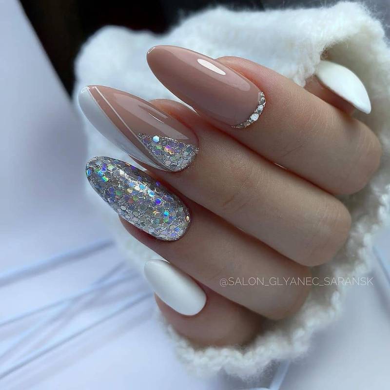 Белый цвет никогда не выходит из моды и прекрасно сочетается в маникюре с различными рисунками и другими цветами. Помимо этого — это один из главных цветов Нового 2021 года, поэтому белоснежные ноготки с праздничным принтом, узорами и сверкающим декором – беспроигрышный и универсальный вариант. Для создания маникюра в соответствующей тематике достаточно просто нанести на ноготки белый лак и выделить блестящими рисунками, например, снежинками или ёлочными шарами, пару ноготков. Если это предложение кажется вам слишком простым, то можно украсить один из пальчиков объёмной композицией из бусин или страз в виде шара или бантика, а на соседней пластине использовать для покрытия мелкие блёстки.