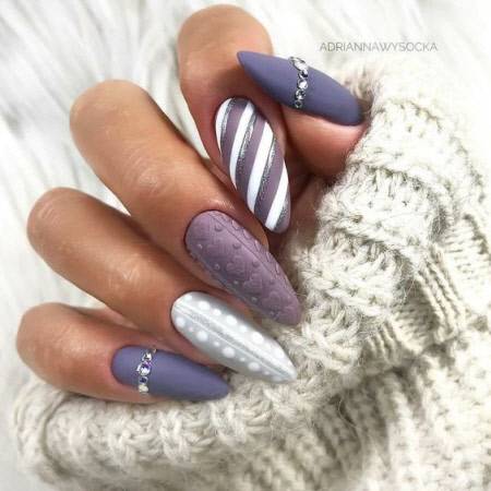 Эффект объемной вязки свитера очень красиво и изысканно смотрится на ногтевых пластинах любой формы и длины. Первые ощущения, с которыми ассоциируются такие узоры, — это тепло и уют, мягкий шарф, плед и кружка ароматного какао или кофе. Для создания вязаного дизайна используются в основном нежные или пастельные оттенки, хотя не менее интересно смотрятся темные и глубокие цвета. Основа под рисунок может быть матовой или глянцевой, все зависит от ваших предпочтений.