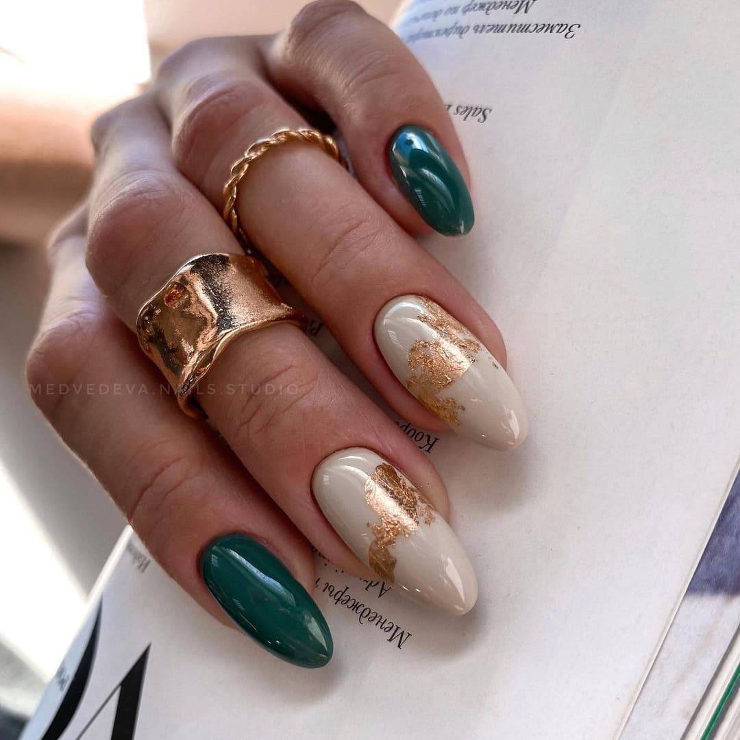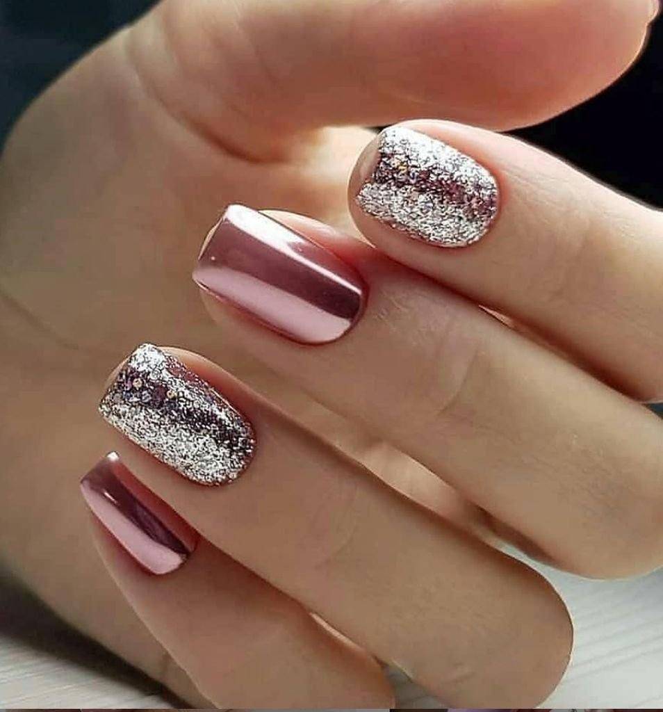 Если у вас очень маленькие ногти, а хочется, чтобы они выглядели длиннее, вот праздничный дизайн, который вам подойдет. Цвета металлик во всю длину ногтя визуально вытягивают и корректирует форму. Модно делать акцент на центральной части или сбоку, конечно, если нравится. Помимо этого рекомендуем золотые и серебряные узоры на «голых» ногтях.
