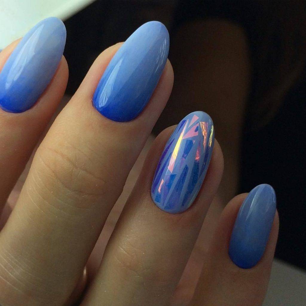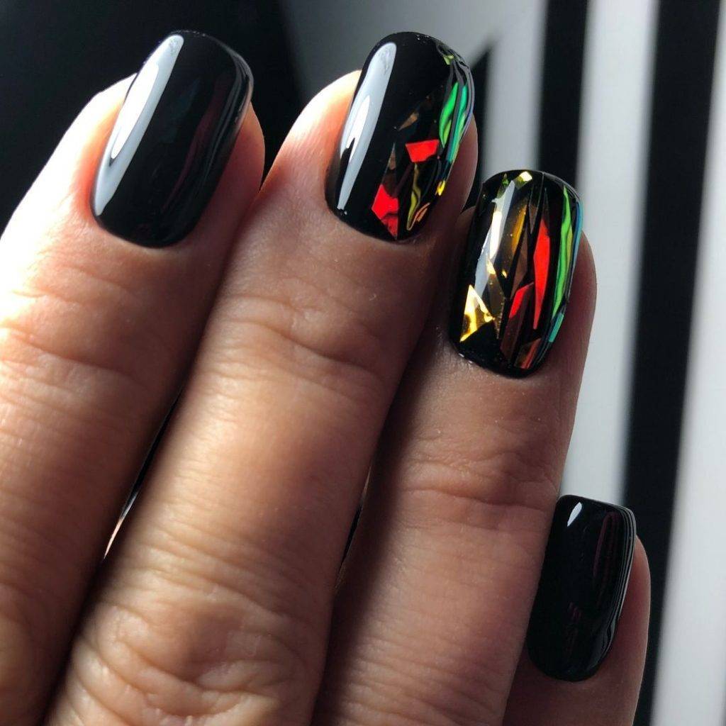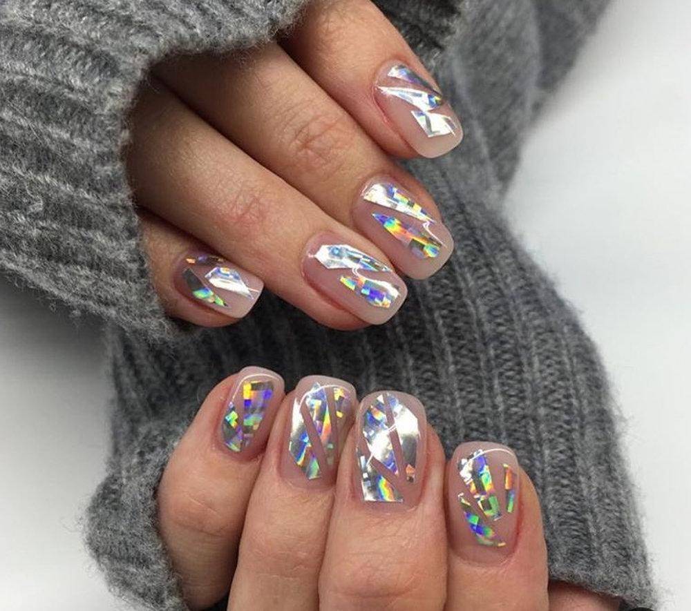 Хотите сделать маникюр, словно из сказки о Снежной королеве? Выбирайте дизайн «битое стекло». Это необычный вариант, когда с помощью кусочков фольги мастер создает на пластине эффект осколков стекла или льда. Смотрится очень многогранно и загадочно.