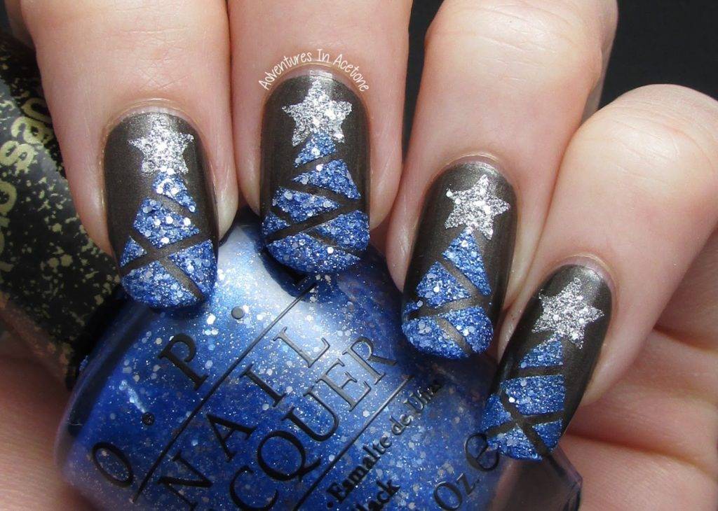 А также можно комбинировать новогодние рисунки с фольгой, блестками и стразами, подбирая нужные цвета.