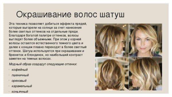 Многие девушка путают омбре, балаяж и шатуш. Однако отличия есть, которые наглядно видны на фотографиях. Главное отличие – отсутствие видимой границы перехода цветов. Окружающие не должны догадаться об эффекте выгорания волос, приняв его за результат воздействия солнца. В шатуш также имеется осветление концов, но в балаяже оно более натурально.