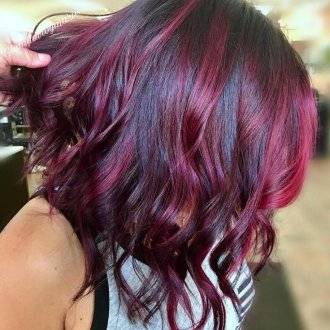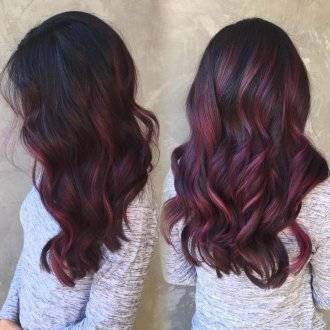 Такую технику колорирования волос выполняют на базе модной палитры, близкой к сливовому вину, глубокому красному – марсала. Винные акценты шикарно смотрятся на шоколадной и каштановой основе.