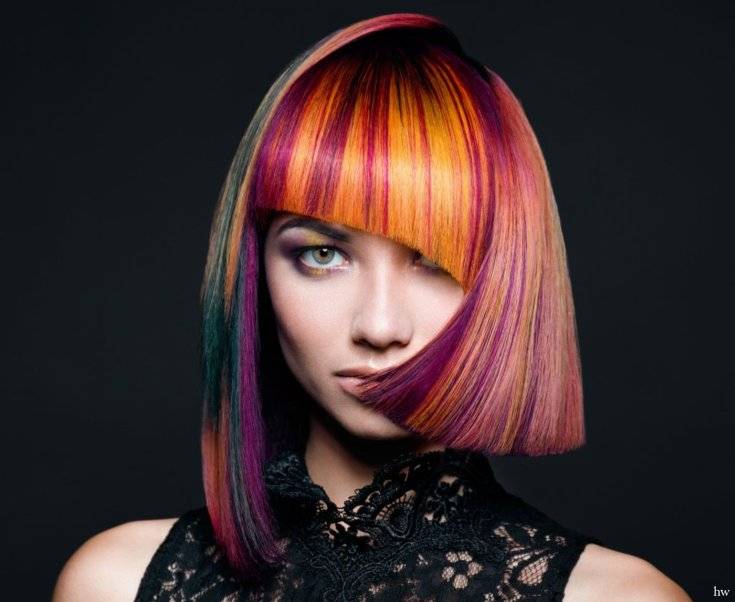 Выделению подвергаются вертикальные пряди, чаще всего используют зеленую, желтую, синюю, красную гамму, в том числе и вместе. Также допустимо моделирование апельсиновых, фиолетовых, ярко-бирюзовых акцентов. Мастера предлагают эффекты «закат солнца» и «космический» – самодостаточные, сочные, запоминающиеся.