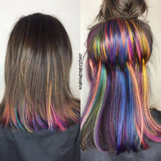 - Многоцветное ― пряди окрашиваются в большое количество оттенков. Они могут быть естественных тонов и создавать эффект объемности и блеска. Или можно выбрать более яркую палитру, что сделает волосы похожими на радугу.
