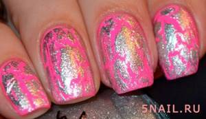 Смешав два или несколько лаков можно добиться эффекта «хамелеон». Особенно интересно выглядит летний маникюр в сочетаниях матового и перламутрового лаков. Для выполнения маникюра-хамелеона необходимо покрыть ногтевую пластину основным лаком и, не дожидаясь высыхания, тонкой кисточкой или зубочисткой нанести несколько капель лака с блеском или перламутром. Соедините оба лака таким образом, чтобы получились разводы. После высыхания рисунок покрывается закрепителем.
