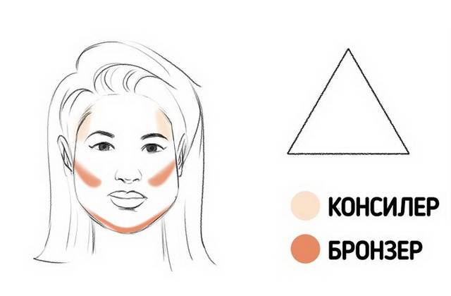 Треугольник определяется широким лбом и заостренным подбородком. Чтобы придать лицу овальную форму, следует затемнить виски и выступающую часть подбородка. Область боковых скул осветляют. В этом случае используются румяна двух цветов. При этом темные цвета оттеняют верхние скулы, а более светлые наносятся на ложбинку в области скул. Акцент делается на глаза.