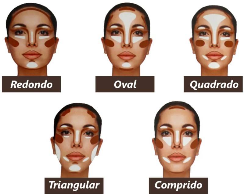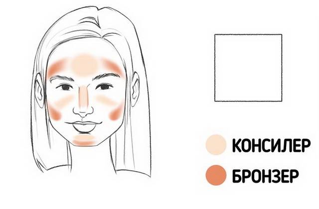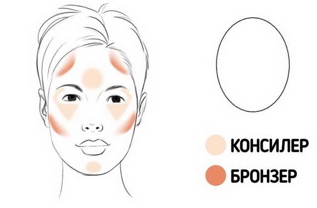Затемнение: бронзер нанести на височные области; боковые поверхности спинок носа; точку между входными носовыми отверстиями.Осветление: использовать общие правила нанесения светлого консилера. Хайлайтер не рекомендуется наносить на лобную часть. Происходит визуальное «утяжеление» лобной поверхности.Румяна: нанести кистью для румян овал, нижняя часть которого развёрнута к подбородку.