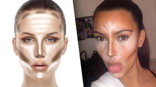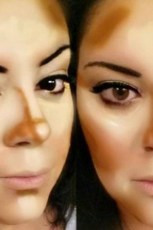- На боковые стороны подбородка нижней челюсти нанести затемняющую косметику, а также на крылья носа, над висками.
