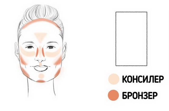 Затемнить бронзером поверхность кожи около зоны роста волос;Не рекомендуется сильно затенять область глаз;Нанести хайлайтер в лобной зоне, над верхней губой;Провести светлую горизонтальную линию в области подбородка.Для румянца: провести горизонтальную линию от носа до средней точки ушной раковины.