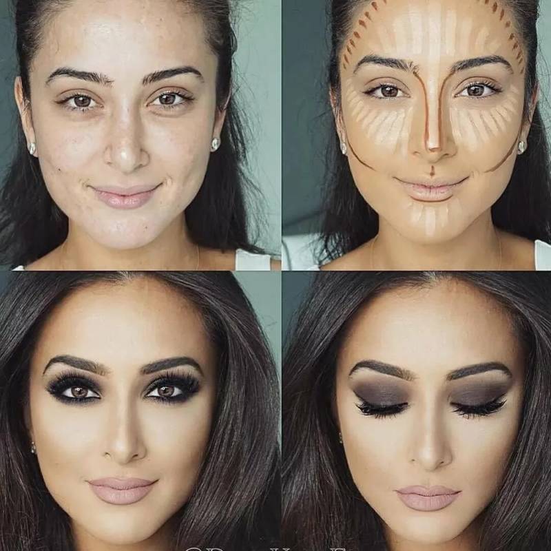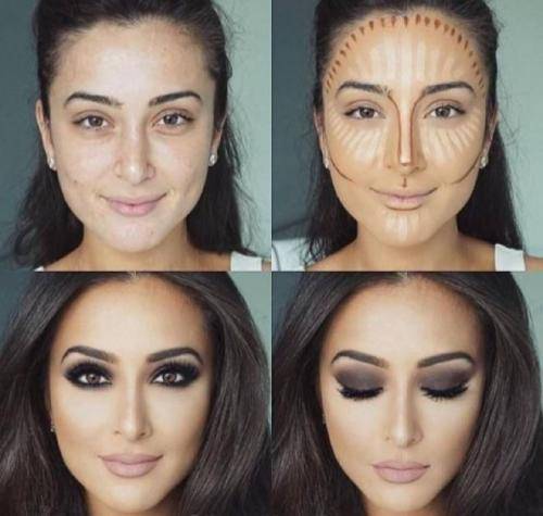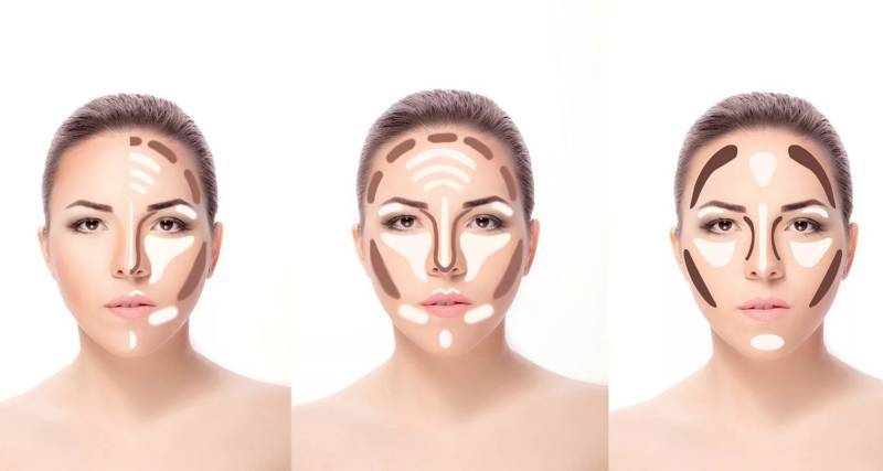 Затемнение: боковые части щек нужно затемнить, причем наносим темный корректор полукругом, следуя формам щёк. Темный контуринг наносим на скулы, не доходя до губ 2 см.Светлый оттенок: хайлайтер наносим по центру лба кругом, а также делаем 2 полосы под глазами, спускающиеся от виска кК верхней центральной части щеки.Румяна: для удаления округлости щек, используем румяна коричневых оттенков; проводим линию, параллельную линии хайлайтера (от виска до скулы) – получится, что линия заканчивается под скулой.