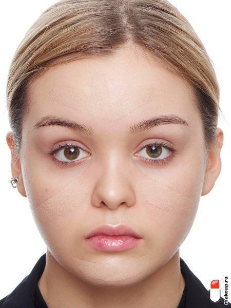 - Сузить круглое лицо можно за счет высветления центральной части лица и затемнения остальных участков кожи.