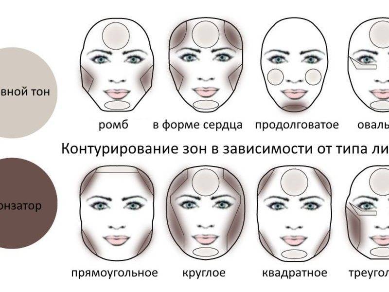 Главная цель контуринга – визуально скорректировать форму лица, либо акцентировать внимание на той или иной его части, скрыв недостатки. Но, в зависимости от формы лица области затемнения и осветления, а также растушевка, имеют свои особенности